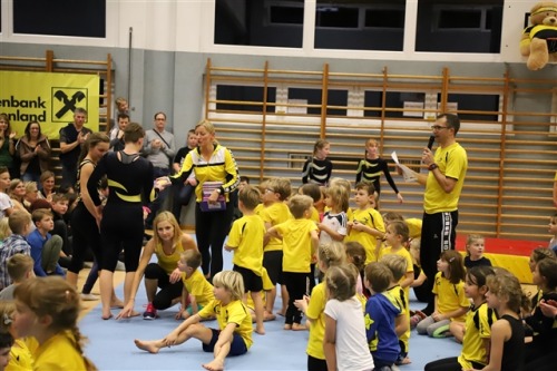 Am Ende der Aufführungen wurden noch alle Trainer und Trainerinnen geehrt - hier nahmen die Kinder der Fortgeschrittenengruppe das Mikrofon in die Hand und überraschten Eveline und Bernd mit einem ganz tollen und besonderem Geschenk.