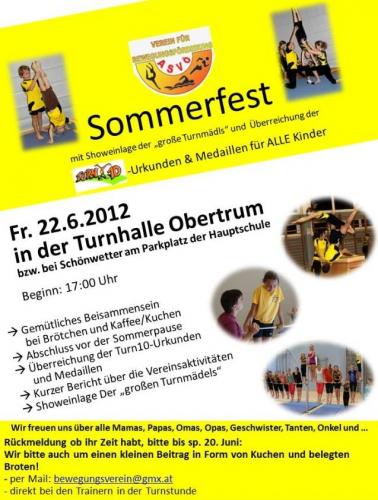 Um das Vereinsjahr würdig vor den Sommerferien zu beenden haben wir uns entschlossen einen kleines Fest zu organisieren. Ein gemütiches Beisammensein sollte hier im Vordergrund stehen. Die "Großen Turnmädels" werden einen kleine Aufführung machen (als Probe für den Trumer Triathlon) und alle anderen Kinder bekommen im Rahmen des Sommerfest ihr Turn10-Abzeichen (Urkunde und Medaille) verliehen.