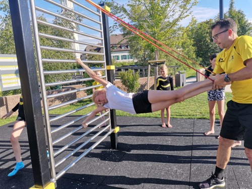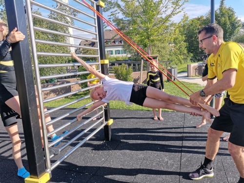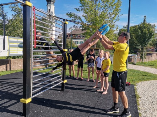 Wir nutzen mit unseren Turnkindern auch die TOP Calisthenics-Anlage in Obertrum, mitten im Ortszentrum, um zu turnen. Auf den Bilder ist jeweils ein "Handstand in Seitlage" zu sehen, in der Fitnessbranche auch als "Flag" bezeichnet: