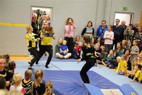 Am Ende der Aufführungen wurden noch alle Trainer und Trainerinnen geehrt - hier nahmen die Kinder der Fortgeschrittenengruppe das Mikrofon in die Hand und überraschten Eveline und Bernd mit einem ganz tollen und besonderem Geschenk.