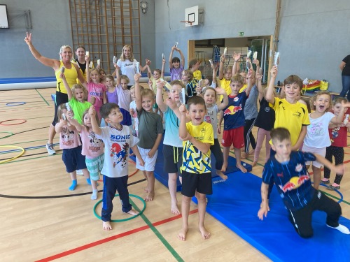 Riesenspass in der Turnhalle! Bei suboptimalem Sommerwetter kamen die 3 Turntage von Montag 28.7.-Mittwoch 30.7.2025 für 35 Kinder gerade recht, um im Turnsaal zu toben!