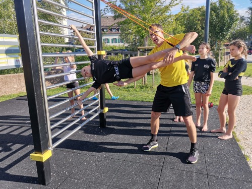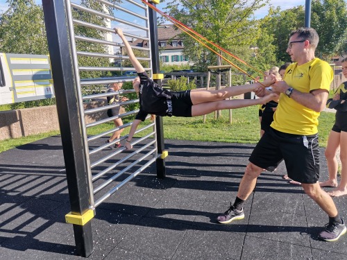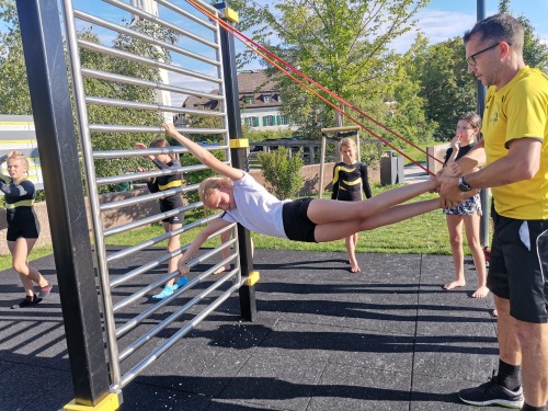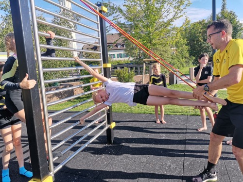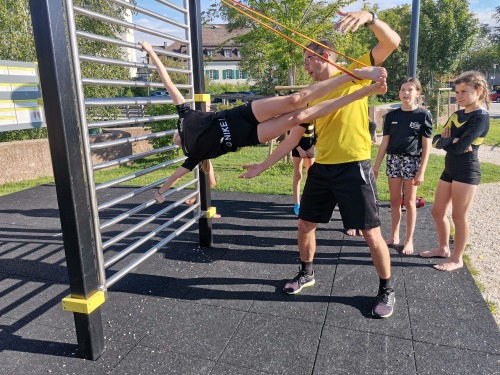 Wir nutzen mit unseren Turnkindern auch die TOP Calisthenics-Anlage in Obertrum, mitten im Ortszentrum, um zu turnen. Auf den Bilder ist jeweils ein "Handstand in Seitlage" zu sehen, in der Fitnessbranche auch als "Flag" bezeichnet: